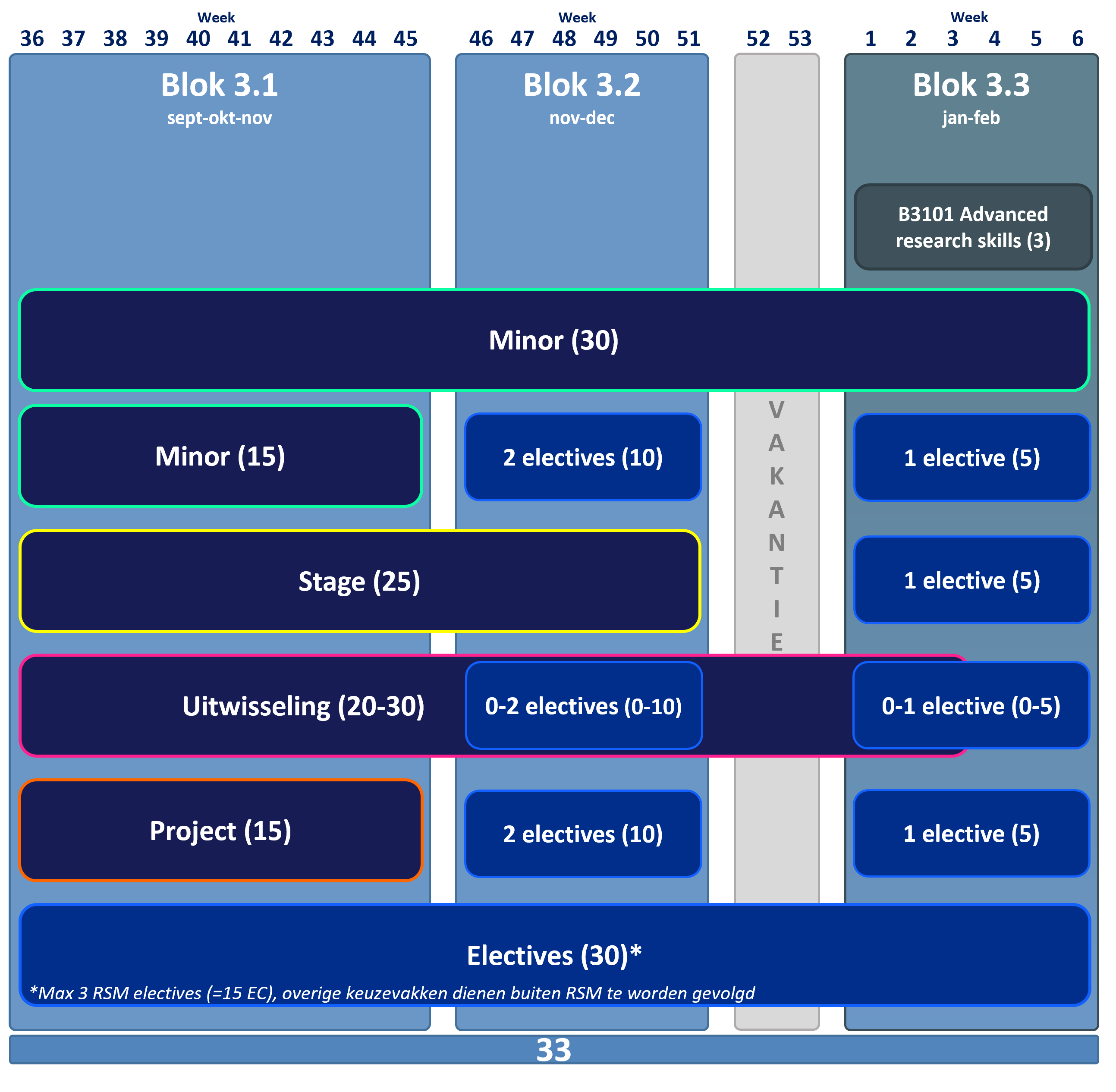 In de eerste helft van Bachelor 3 stel je zelf een programma samen van in totaal 30 EC. Je hebt hierbij keuze uit onder andere minoren, een stage, of uitwisseling. Afhankelijk van het aantal EC dat je hiermee behaalt, dien je dit aan te vullen tot minimaal 30 EC met keuzevakken. Als je geen minor, stage of uitwisseling volgt, mag je de volledige 30 EC opvullen met keuzevakken (max 3 RSM electives per collegejaar).